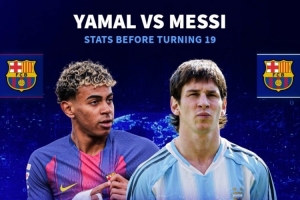 球员19岁之前数据:亚马尔38球55助,梅西11球9助,C罗6球11助