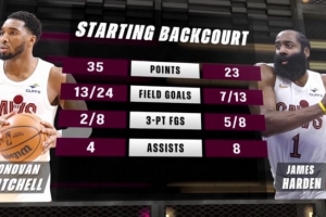 米切尔本场24中13,三分8中2砍下35分4助攻;哈登13中7,三分8中5砍下23分8助攻。